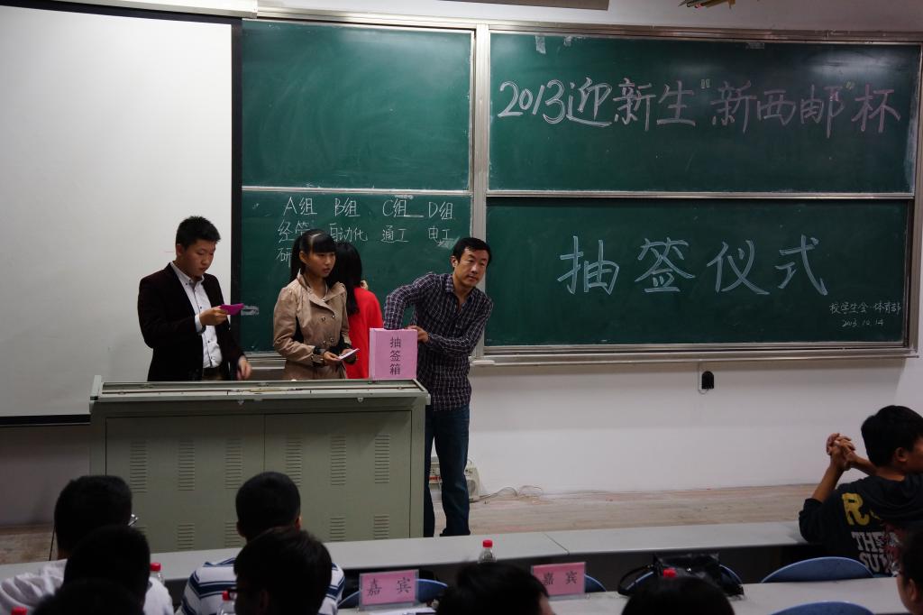 (本网讯)10月14日,由校团委、校体育部主办,校学生会体育部承办的2013迎新生“新西邮”杯篮球赛的抽签仪式在基础教学楼B322举行。校篮球队教练祝涛、校学生会副主席张亢辉、校学生会体育部携各院体育部部长出席了本次仪式。