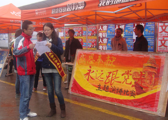 (本网讯)为迎接中共十八大召开,10月29日,以“感恩、奉献、永远跟党走”为主题的大型演讲比赛宣传活动在旭日苑门前正式启动。本次活动由校团委主办,校学生会办公室承办。