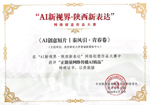 本网讯(通讯员 严凰)2月10日,由中共陕西省委网络安全和信息化委员会办公室办主办的“AI新视界·陕西新表达”网络创意作品大赛评选结果正式揭晓。我校报送的AI创意短片《秦风引·青春卷》获评“正能量网络传播AI精品”。