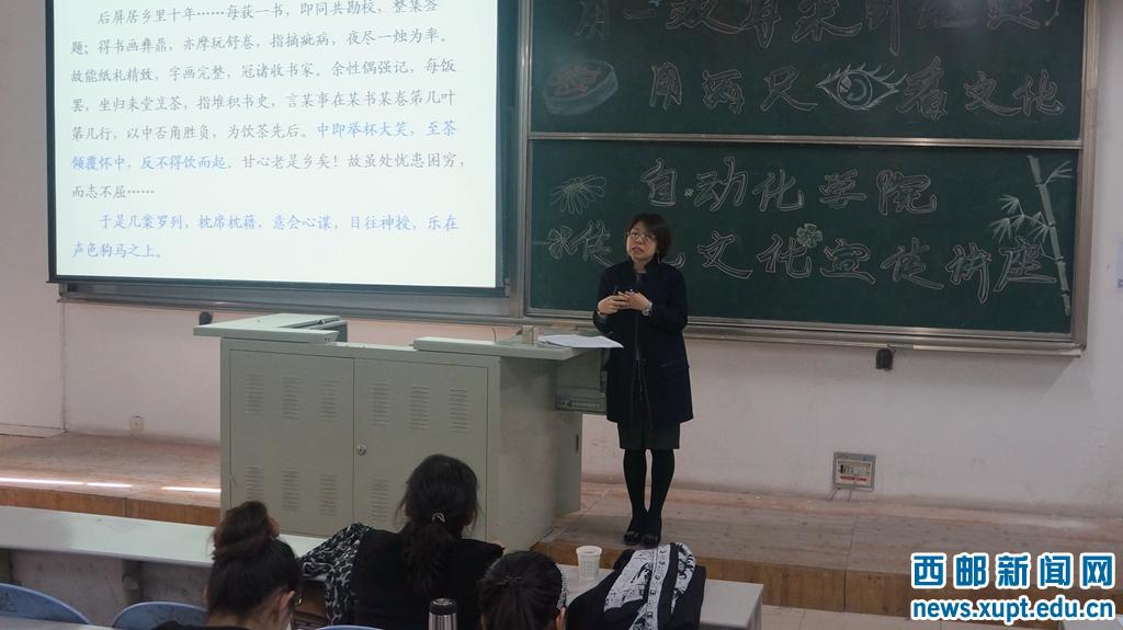 (本网讯)12月12日中午,西北大学文学院周建姣副教授在我校长安校区B104教室举办“用一双耳朵听经典、用两只眼睛看文化”中国优秀传统文化讲座,自动化学院近200名同学参加讲座,讲座由自动化学院党委副书记卢岩主持。