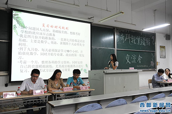 (本网讯)5月19日晚,自动化学院在长安校区B214教室举行考研就业经验交流会,邀请2010级优秀学生将各自在考研、就业过程中的历程和经验与同学们进行了交流和分享。该院副书记卢岩、辅导员张青平和近300名同学参加交流会。