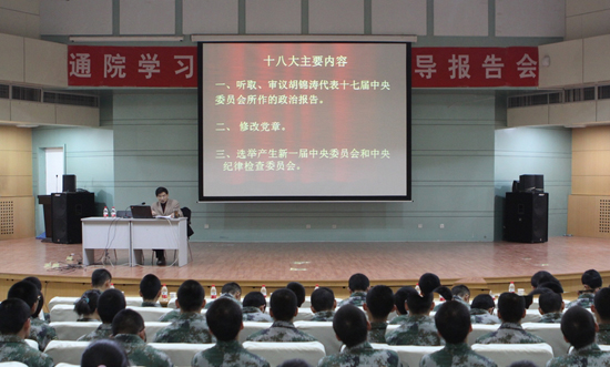 本次报告旨在让通院学生全面解读十八大精神,认真贯学习彻落实十八大精神,为构建和谐校园贡献自己的力量。