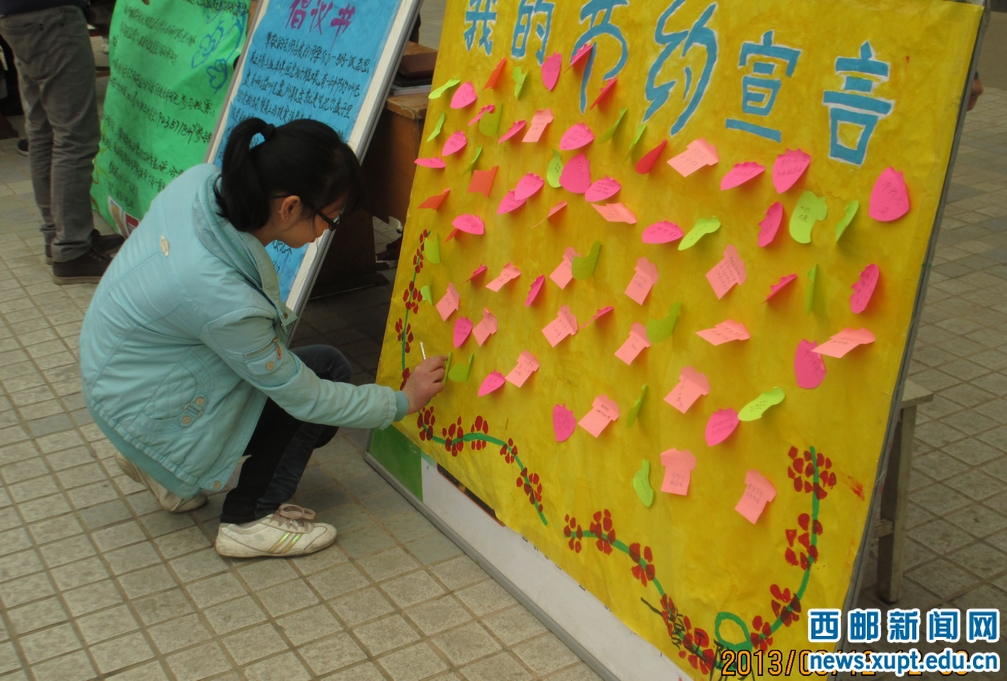 (本网讯)3月12日,管工院学生会在雁塔校区图书馆前开展“我是西邮人,我为节约代言”主题签名活动,活动现场的同学们纷纷写出了自己的节约宣言。管工院学生会还组织志愿者们深入食堂,提醒同学们文明就餐,排队打饭,勤俭节约,不浪费粮食,做“光盘”一族,餐后主动将餐盘送回。活动号召同学们:以“光盘”为荣,以“剩宴为耻”,加入“光盘”族,争做“节约达人”,笔墨纸砚,水电米粒,抓住你指间流过的浪费,我是西邮人,我为节约代言。从点滴开始,从餐饮开始,从养成良好地生活习惯开始,将口号变成行动,将行动化为习惯。