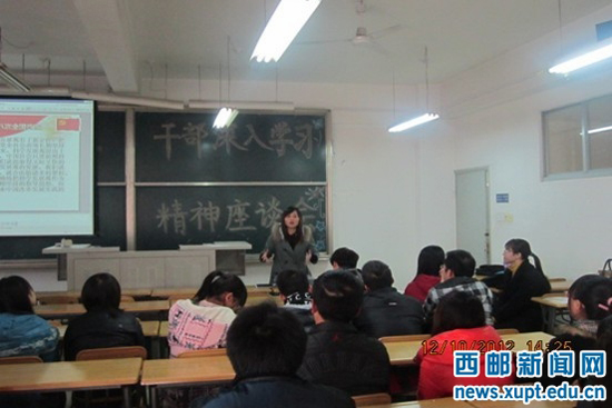 (本网讯)12月10日下午,理学院在长安校区基础教学楼A437召开学习十八大精神团学干部座谈会。理学院全体辅导员、分团委副书记及全体团学干部参加座谈。